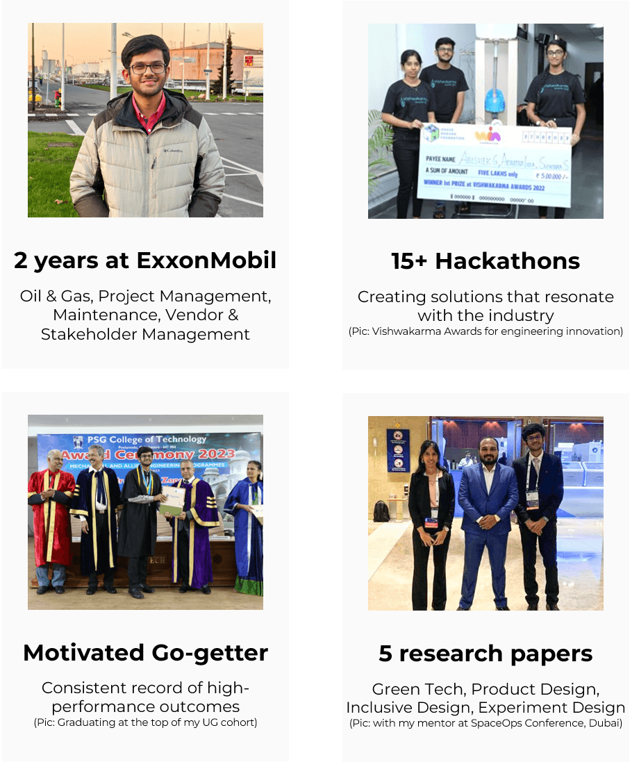 I had the privilege of working with Abishek on tankage maintenance activities during his time as a Maintenance Engineer at ExxonMobil. From the very beginning, Abishek demonstrated a strong commitment to delivering value through his passion, dedication, and eagerness to learn and contribute meaningfully.